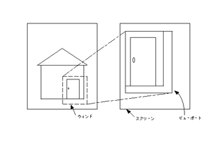 ワールド座標系で定義された図形のどの部分を表示したいかを指定するための枠(一般に長方形)がウィンド(window)である。このウィンドを指定したあと、出力装置のディスプレイ上のどこへ表示したいかを指定するための枠がビューポート(viewport)である(図2.2参照)。