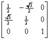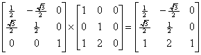 (2.5)このように、同次座標を使うと、多くの変換を統一的な3×3の変換行列の形式で書ける。また、多くの変換を続けて行う際、変換行列を予めかけ合わせることができる。例えば、-60度回転した後[1 2]ほど移動を考える。まず、回転行列は次式となる。