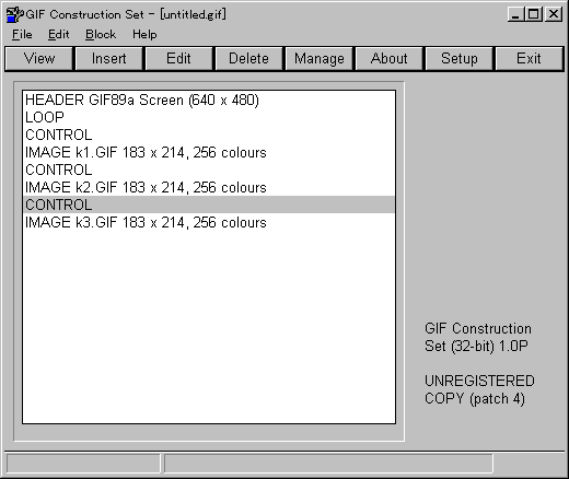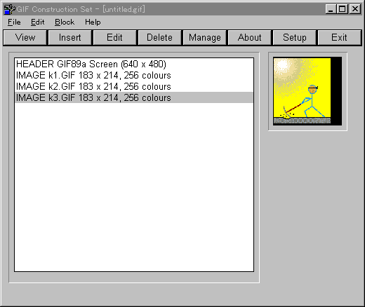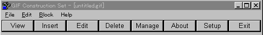 A「GIF Construction Set」を用いて、以下の手順でマルチプルイメージを作成します。(GIF Construction SetはAlchemy Mindworks社のシェアウェアで、マルチプルイメージのGIFを作るツールです。)