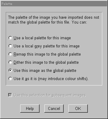 B[Use this image as the global palette]をチェックする。複数のイメージを登録するときは [Use this selection for subsequent images]もチェックする。